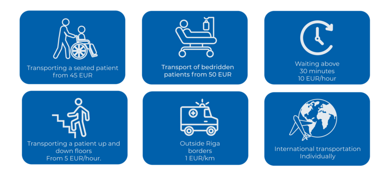 We ensure safe patient transport using specialized, medically equipped vehicles suitable for both seated and bedridden patients. The price for transporting seated patients starts from 45 EUR, while transportation of bedridden patients starts from 50 EUR.